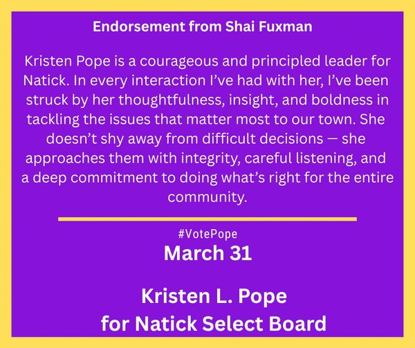 I’m proud to endorse Kristen Pope for reelection to the Natick Select Board. As a Natick resident whose work focuses on equity, I’ve been consistently impressed by Kristen’s leadership. Equity is not just a talking point for Kristen; rather, it's a guiding value and central to how she approaches decision making, representation, and access in our town. Plainly speaking, Kristen gets it. She leads with integrity, listens with care, and keeps people at the forefront of her work. Natick is stronger because of Kristen, and I strongly support her reelection.