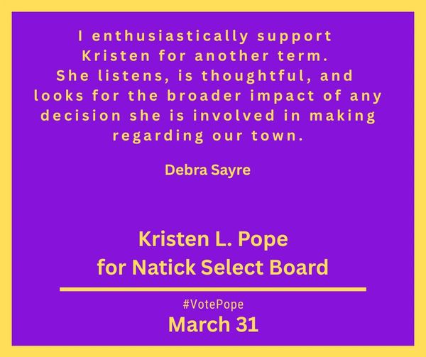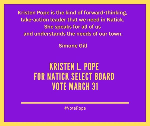 I am grateful to Kristen for her steady leadership, dedication, compassion and knowledge. Please join me in voting to re-elect Kristen Pope to the Natick Select Board.